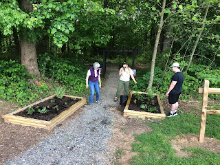 On Thursday, April 13th, DRBA staff along with volunteers, planted native plants for pollinators, installed a butterfly bench, and created a meditation circle. At first we had planned to put native plants to attract butterflies, particularly Monarch Butterflies, in two raised flower beds at the entrance to the trail, but then discovered after the trees leafed out that both beds are in the shade. So we reverted to Plan B, and built a bed around the trail kiosk that would be in the sun, then planted shade plants in the two shaded beds. There is also a boardwalk in the middle of the trail that leads out to an observation deck overlooking a valley under the power line that should have many naturally growing plants to attract butterflies. We also planted some purchased native plants there, too.