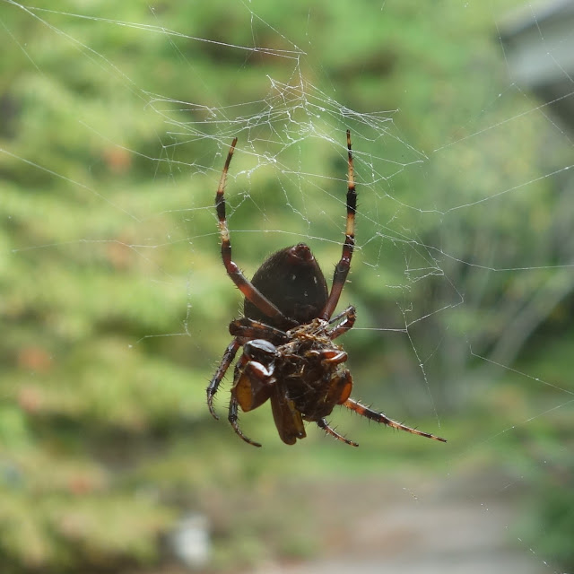 These orb weavers are nocturnal, but like to hang out in the center of their webs on fall mornings. Looking around, I found another massive web across the sliding glass door to my bedroom. This one had a smaller (male) spider hanging out on the edge. I came back later and found she had "invited" him for lunch. She tossed the too-crunchy parts when she was done.....